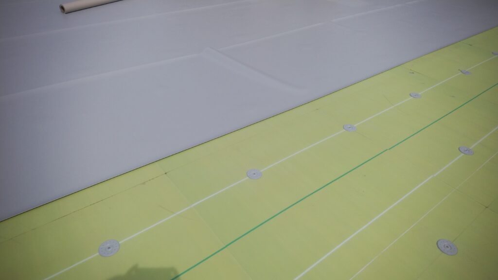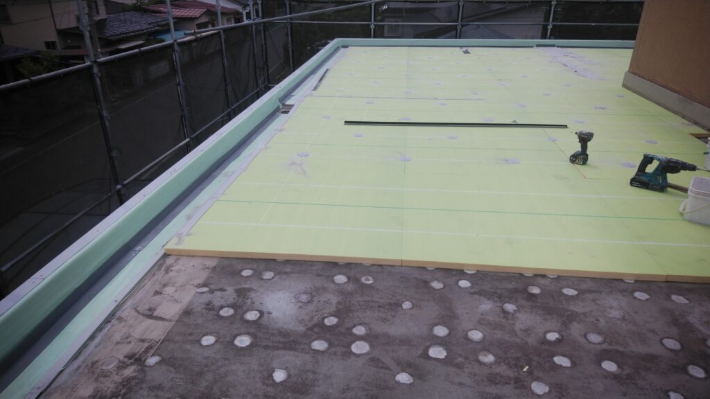 塩ビシート防水 お施主様の希望で暑さ対策、断熱材を入れる仕様 断熱機械固定工法